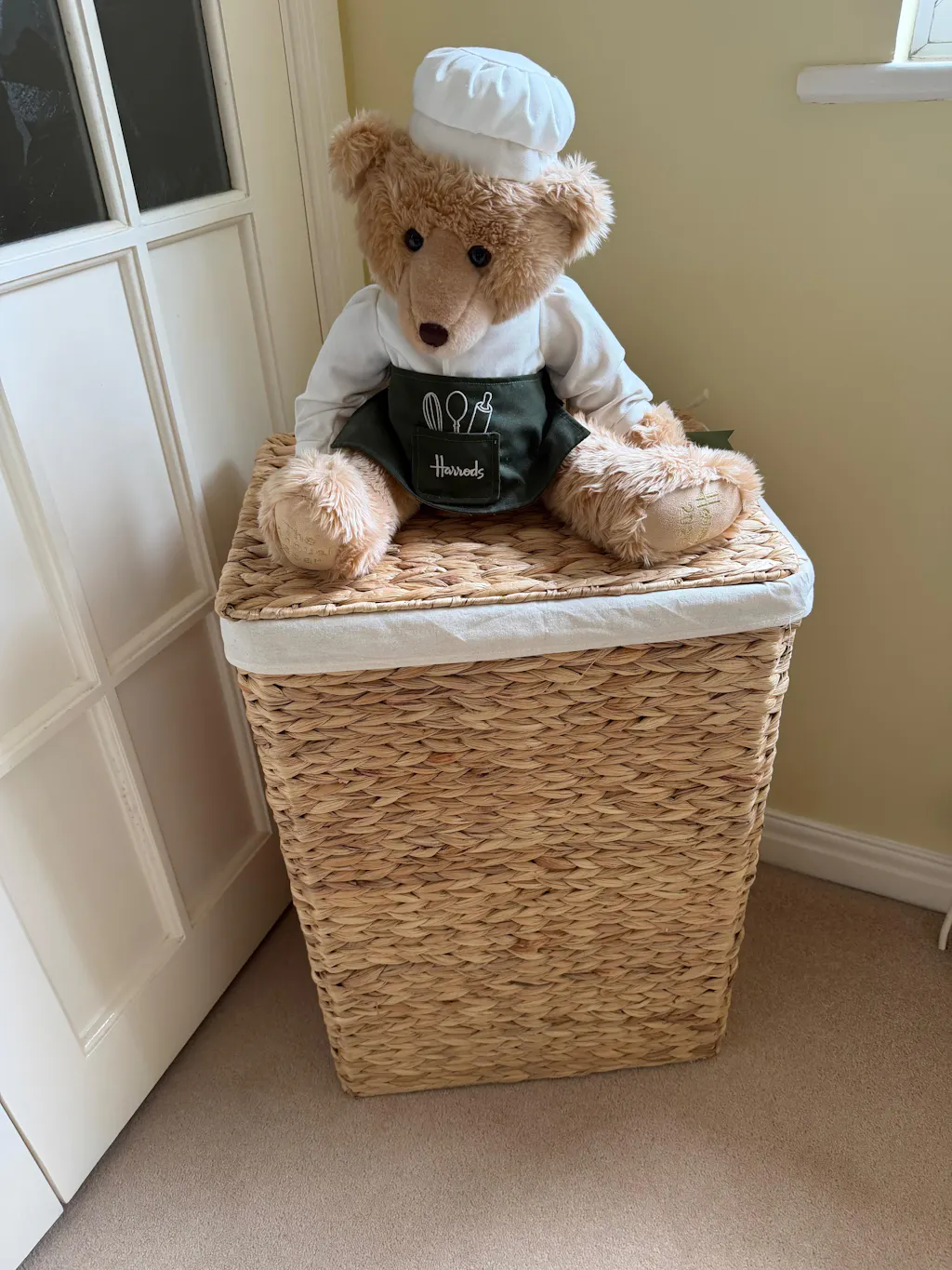 Each basket includes a removable cotton lining, inset carry handles, and a hinged lid. Fully assembled and available in three sizes: Small, Medium or Large. It’s a practical option for storing laundry in any room.